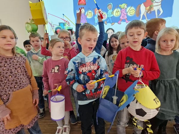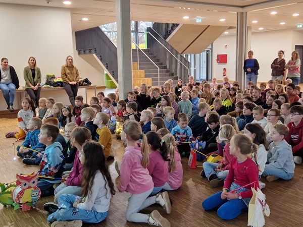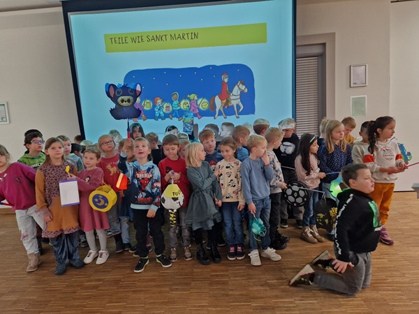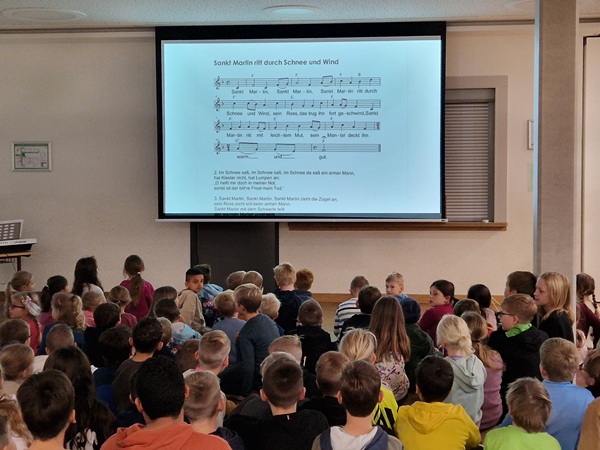 Im Anschluss daran versammelte sich die ganze Schulgemeinschaft in der Aula der Schule. Es wurden Martinslieder gesungen und die Geschichte des Heiligen Mannes erzählt.