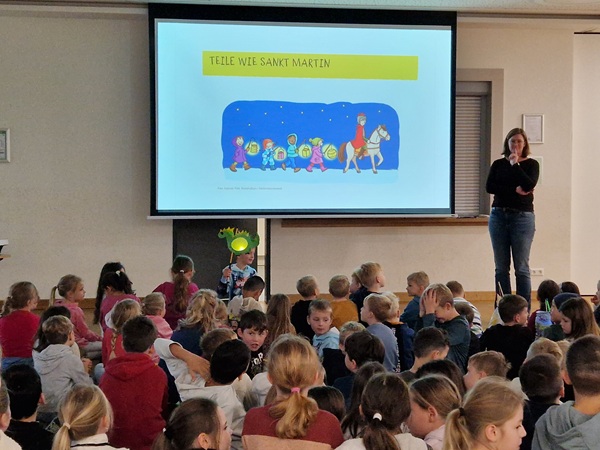 Im Anschluss daran versammelte sich die ganze Schulgemeinschaft in der Aula der Schule. Es wurden Martinslieder gesungen und die Geschichte des Heiligen Mannes erzählt.