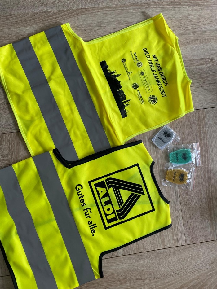 Pünktlich zu Beginn der dunklen Jahreszeit erhielten die Erstklässler Warnwesten, die sie auf ihrem Schulweg morgens gut erkennbar machen. Auch für die Schüler und Schülerinnen der Klassen 2 wurden die gut sichtbaren Westen abgegeben. Des Weiteren brachte Lina aus der Klasse 3 Reflektoren mit, die an die Schultaschen oder Jacken gehängt werden können. Auch die tragen dazu bei, dass an dunklen Tagen die Kinder von Autofahrern rechtzeitig zu erkennen sind.